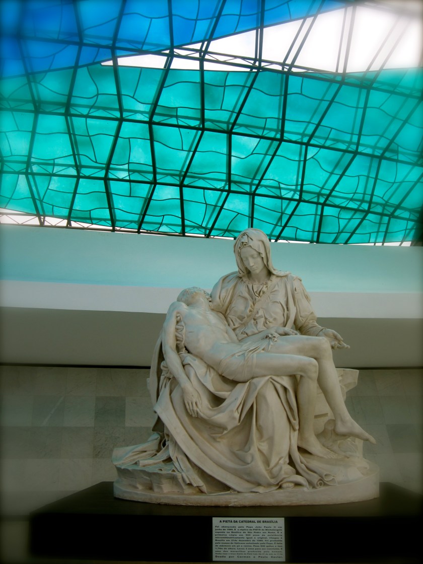 For such special city, an equally singular Cathedral was designed and built. On 12th September 1958, the Cathedral’s cornerstone was laid. The Metropolitan Cathedral of Brasilia is an expression of the geniality of the architect Oscar Niemeyer. In 1960, the Cathedral’s structure was finished, and only the 70 m diameter of the circular area and the 16 concrete columns were visible. These columns, having parabolic section and weighing 90 t, represent two hands moving upwards to heaven. The Cathedral was dedicated on the 31st May, 1970. At that time it had already the external transparent window. Four bronze sculptures 3 m high, representing the Evangelists, can be seen at the external square in the entrance of the Temple. These sculptures were made with the help of the sculptor Dante Croce, in 1968. Inside the nave, three sculptures of angels are suspended by steel cables.