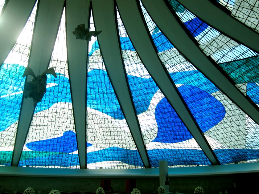 The smallest angel has 2,22 m of length and weighs 100 kg. The medium one has 3,40 m of length and weighs 200 kg. The big one has 4,25 m of length and 300 kg weighs. The sculptures were made by Alfredo Ceschiatti, with the help of Dante Croce, in 1970. The nave stained glass is made of 16 pieces of fibreglass. These pieces, in colours of blue, white and brown, were fixed between the concrete columns, in triangles of 10 m of base and 30 m of height. They were painted in 1990 by Marianne Peretti. Having an oval form, the Baptistery has its walls covered by a panel of ceramic tiles painted in 1977 by Athos Bulcão. The local architecture is completed by a bell tower. Its four big bells were donated by Spain.